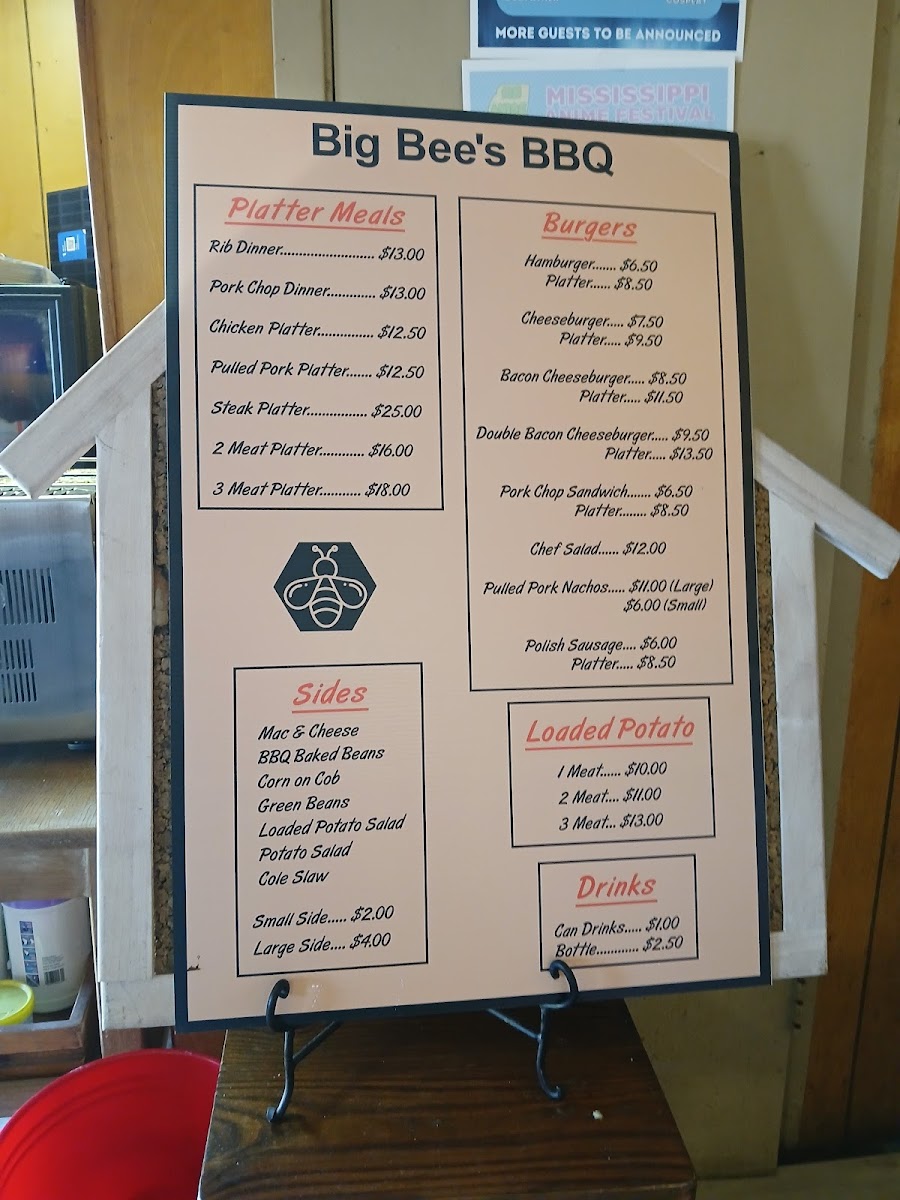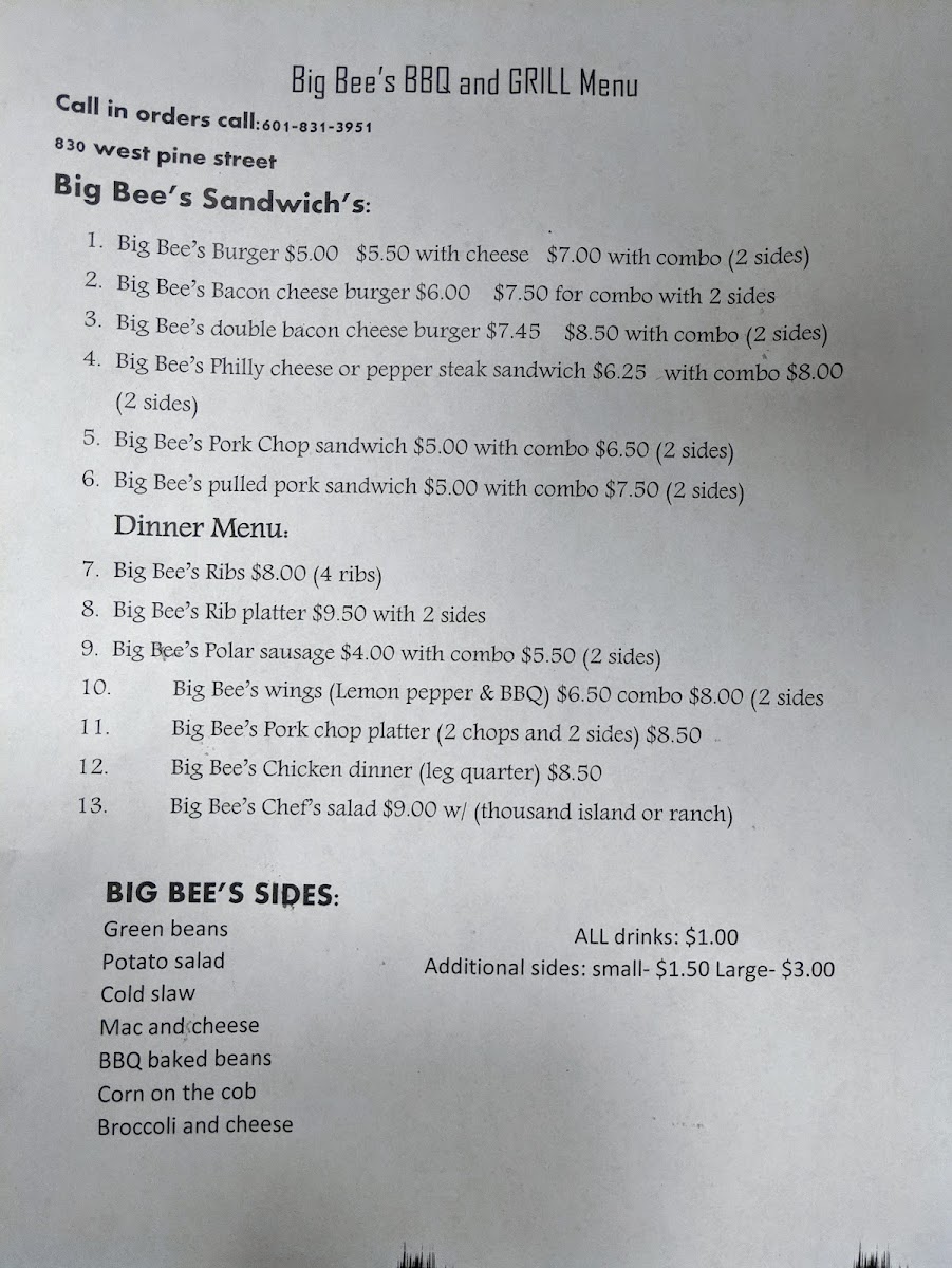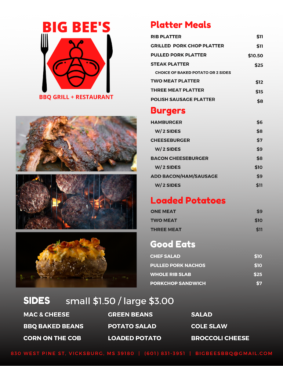At Big Bees BBQ Grill & Restaurant, the menu is a true celebration of Southern flavors and hearty comfort food. Located in the heart of Vicksburg, Mississippi, this spot is all about serving up the finest barbecue with a twist of Southern hospitality. Whether you’re craving tender, slow-cooked ribs or perfectly smoked brisket, there's something to satisfy every meat lover’s appetite. Their menu features a mix of smoky meats, fresh sides, and signature sauces that bring out the best in every bite. You’ll also find a range of sides like classic coleslaw, baked beans, and golden cornbread to complement your meal. If you're in the mood for something lighter, their salads and seafood options are just as delightful. Perfect for a casual night out or a family gathering, Big Bees BBQ Grill & Restaurant promises a laid-back dining experience with flavors that keep you coming back for more.