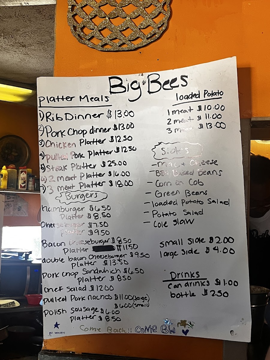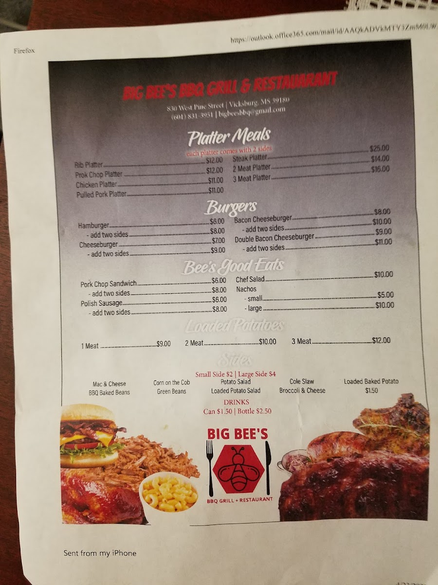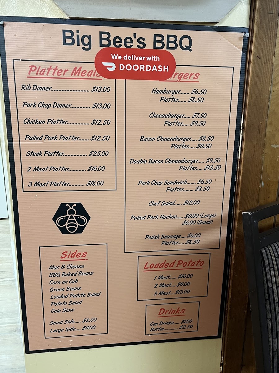 At Big Bees BBQ Grill & Restaurant, the menu is a true celebration of Southern flavors and hearty comfort food. Located in the heart of Vicksburg, Mississippi, this spot is all about serving up the finest barbecue with a twist of Southern hospitality. Whether you’re craving tender, slow-cooked ribs or perfectly smoked brisket, there's something to satisfy every meat lover’s appetite. Their menu features a mix of smoky meats, fresh sides, and signature sauces that bring out the best in every bite. You’ll also find a range of sides like classic coleslaw, baked beans, and golden cornbread to complement your meal. If you're in the mood for something lighter, their salads and seafood options are just as delightful. Perfect for a casual night out or a family gathering, Big Bees BBQ Grill & Restaurant promises a laid-back dining experience with flavors that keep you coming back for more.